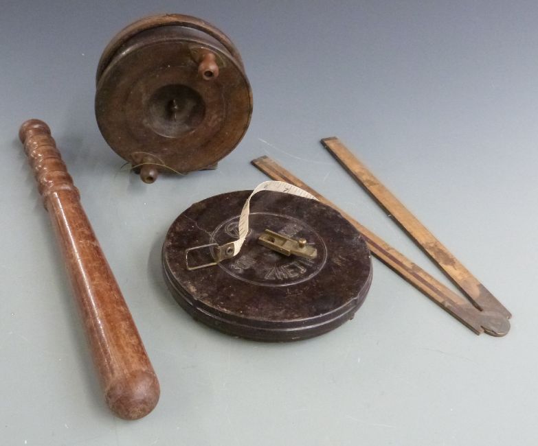 Bonsa 'The Electric' multitool, possibly German military, welding/gas dials and nozzles, truncheon, folding ruler, wind-up 30m tape, vintage fishing reel etc