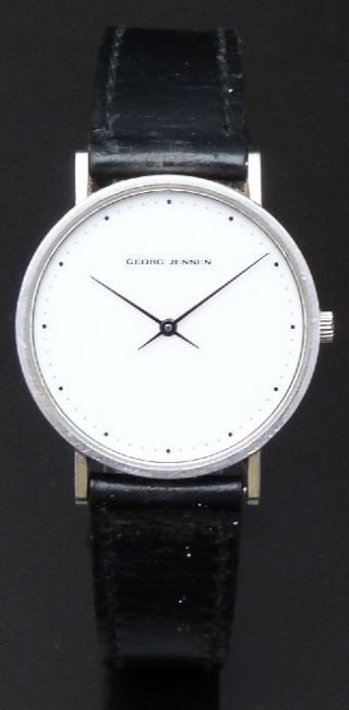 Georg Jensen gentleman's wristwatch ref. 321 with black hands and dot markers, white dial, stainless steel case and quartz movement, on black leather strap, case diameter 33mm, serial number 123629.