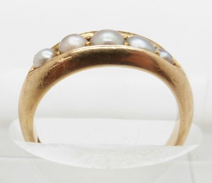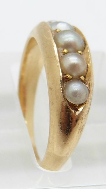 Victorian 18ct gold ring set with five graduated pearls, 4.7g