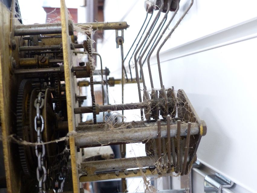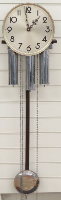 German made mid 20thC caseless wall clock with three chromium plated weights, matching pendulum bob and 30cm Arabic dial