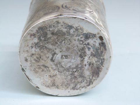18th century Danish white metal beaker with engraved scrolling decoration, with Danish silver marks to underside having IR above a clover leaf and also marked AK, height 8.5cm weight 108g