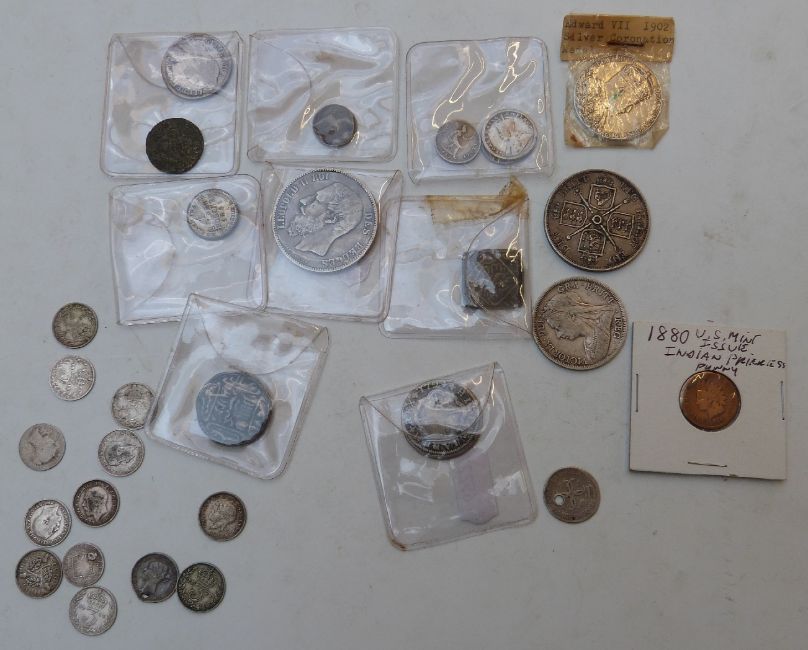 A small interesting collection of coins, 18thC onwards, largely silver, including Phillip of Spain, William III shilling, Charles II, Victoria etc