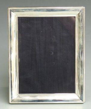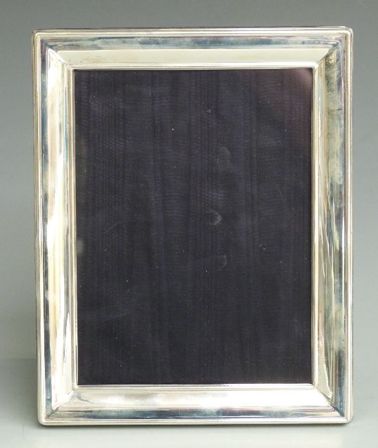 Modern hallmarked silver photograph frame to suit 8x6 inch photo, with blue velvet easel back, Birmingham 2008 maker's mark PJP, in box