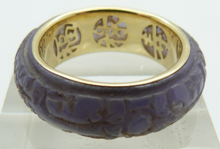 Chinese 14ct gold ring set with carved purple jade, 5g, size P