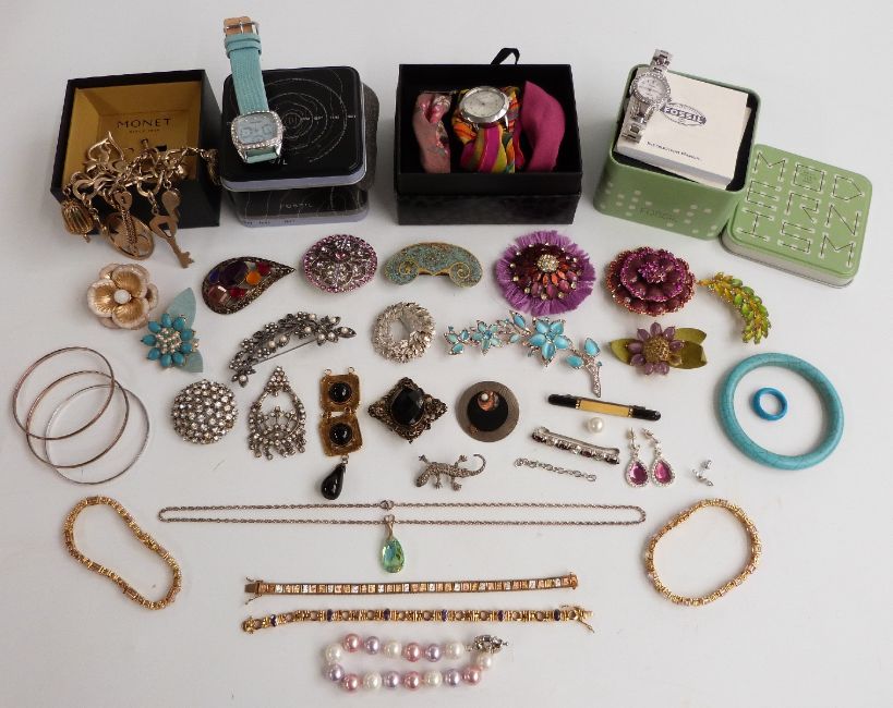 A collection of costume jewellery including vintage brooches, Art Deco brooch, silver bracelets, etc