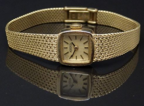 Roamer 18ct gold ladies wristwatch with black hands, gold baton markers, gold dial and signed 19 jewel calibre 466 movement, on integral 18ct gold bracelet, case diameter 14.5mm, serial number 466 8620 707, 27g, in original box.