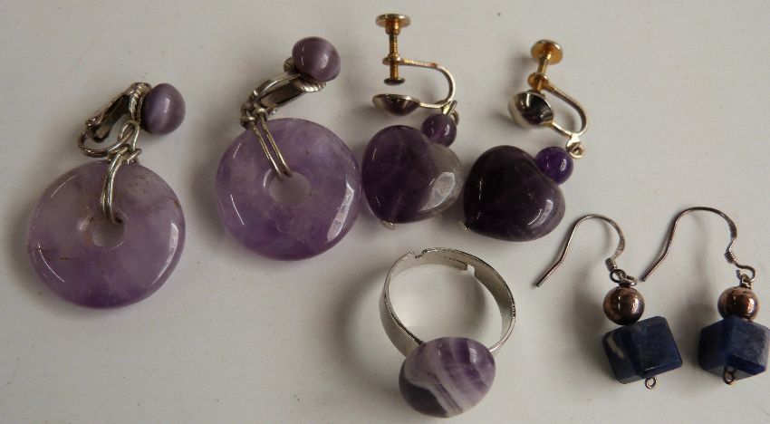 A collection of costume jewellery including agate earrings, vintage earrings, buttons etc