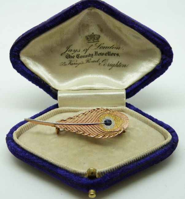 A tri-coloured gold brooch in the form of a peacock feather set with a sapphire, in original Jays of London, 55 Kings Road, Brighton box, 3.7g