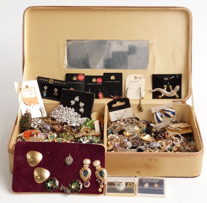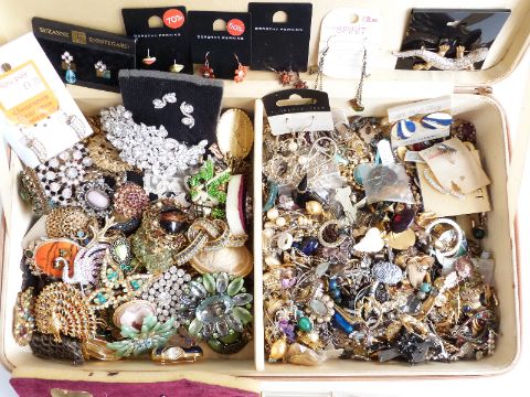 Collection of vintage brooches including paste, enamel, and vintage earrings