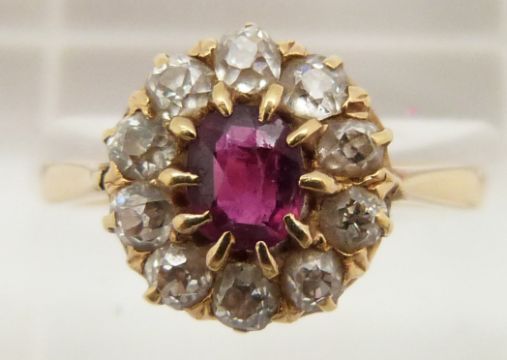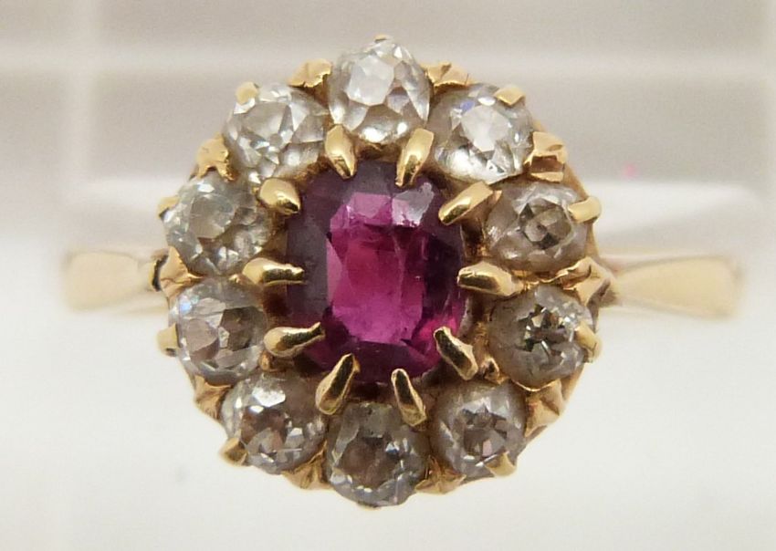 Victorian 18ct gold ring set with an oval cut ruby surrounded by old cut diamonds, 3.3g, size N