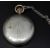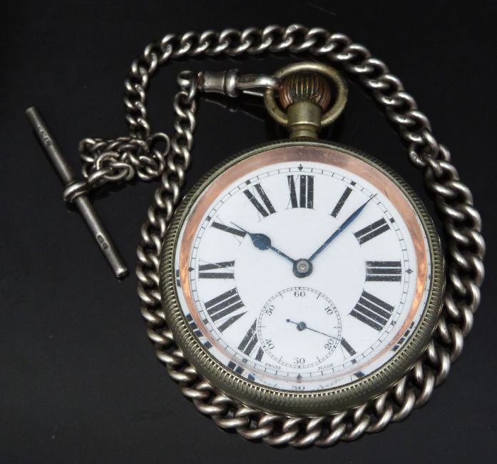 Keyless winding open faced pocket watch with subsidiary seconds dial, blued hands, black Roman numerals, white enamel dial, nickel plated case marked to the back with ministry broad arrow and 'PATT 300 1659' and 15 jewel movement, on hallmarked silver chain, case diameter 54mm.