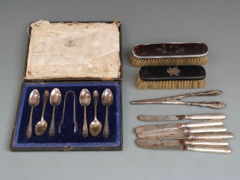 Mappin and Webb cased set of six hallmarked silver teaspoons and tongs, weight 92g together with a set of six hallmarked silver handled knives, silver handled glove stretchers and two brushes, one tortoiseshell with silver mounts