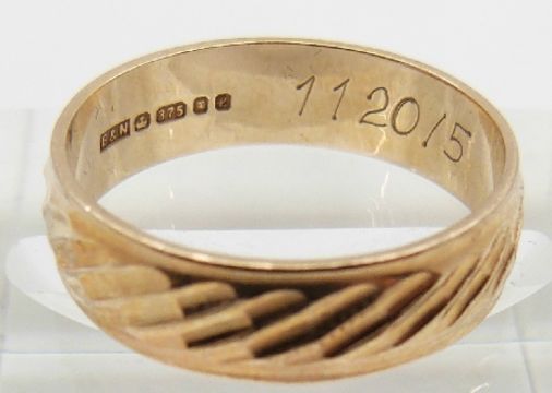 A 9ct gold wedding band/ ring with textured detail, 2.4g, size L