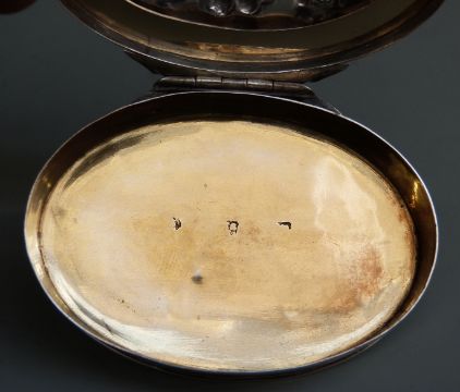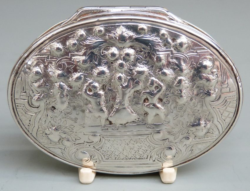 18th century hallmarked silver snuff box, the embossed baroque lid with figures dancing on a stage opening to reveal a gilt interior, maker's mark indistinct but looks to be IS, width 73mm
