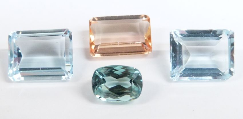 Two emerald cut aquamarines measuring approximately 1.8ct each, a cushion cut aquamarine measuring approximately 0.9ct and a rectangular cut andalusite measuring approximately 1.2ct