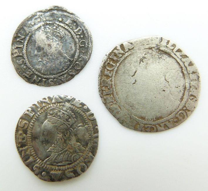 Elizabeth I (1558-1603) hammered silver threepence 1569 F together with a threehalfpence VF, and a penny, toned GF