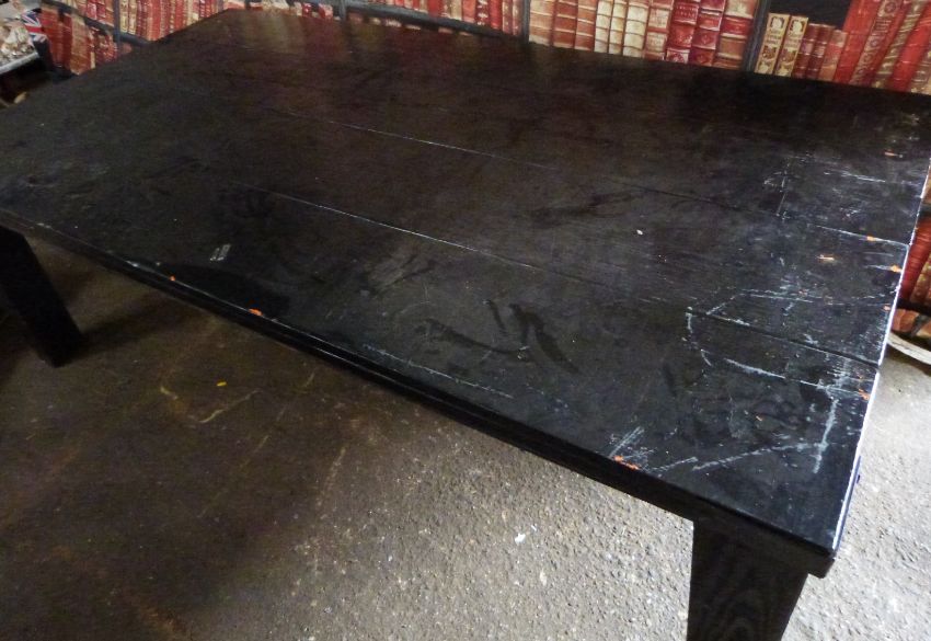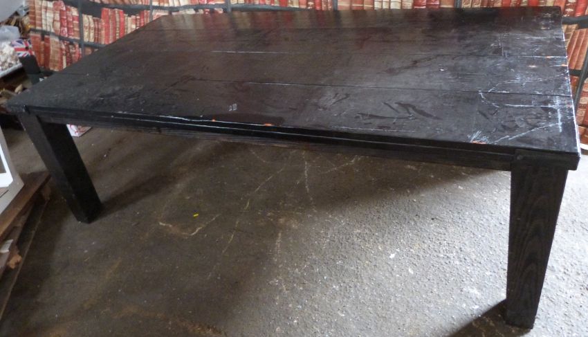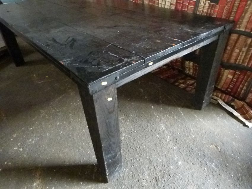 Industrial/haberdashery/shopfitting metal bound four plank top table, W220 x D120 x H74cm