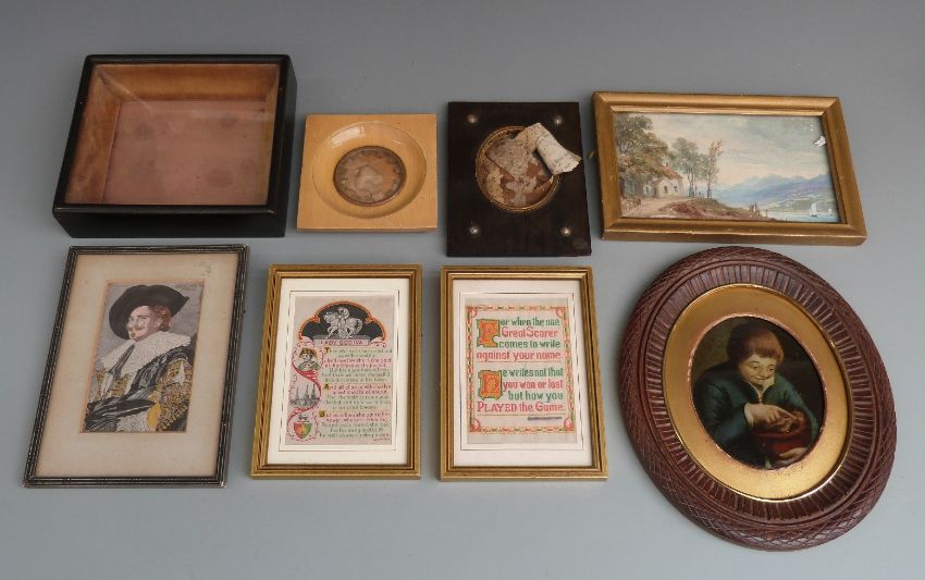 Collection of pictures, miniature frames, 19thC glass case, stevengraph or similar silks etc, largest 15 x 23cm overall