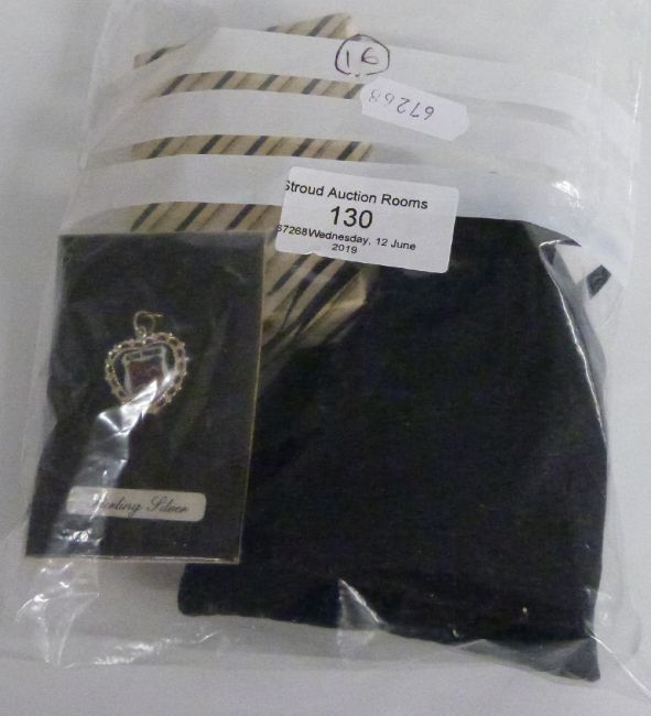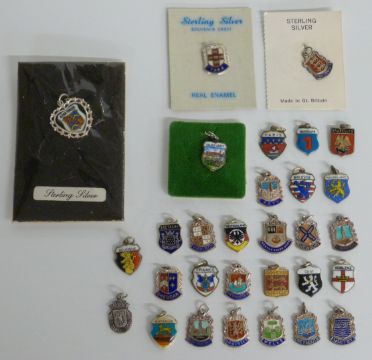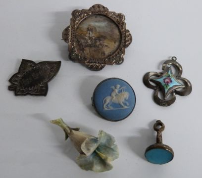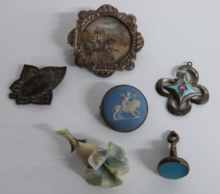 Three silver St Christophers, brooch with a landscape picture, Wedgwood brooch, silver brooch, silver pendant, RAF cufflinks, charms etc