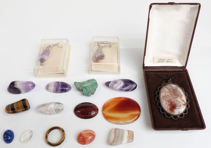 Sixteen pieces of agate and amethyst jewellery, pebbles, samples etc