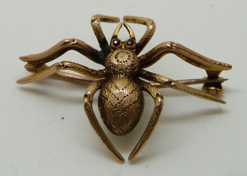 9ct gold brooch in the form of a spider with textured body set with ruby eyes, 3.2g