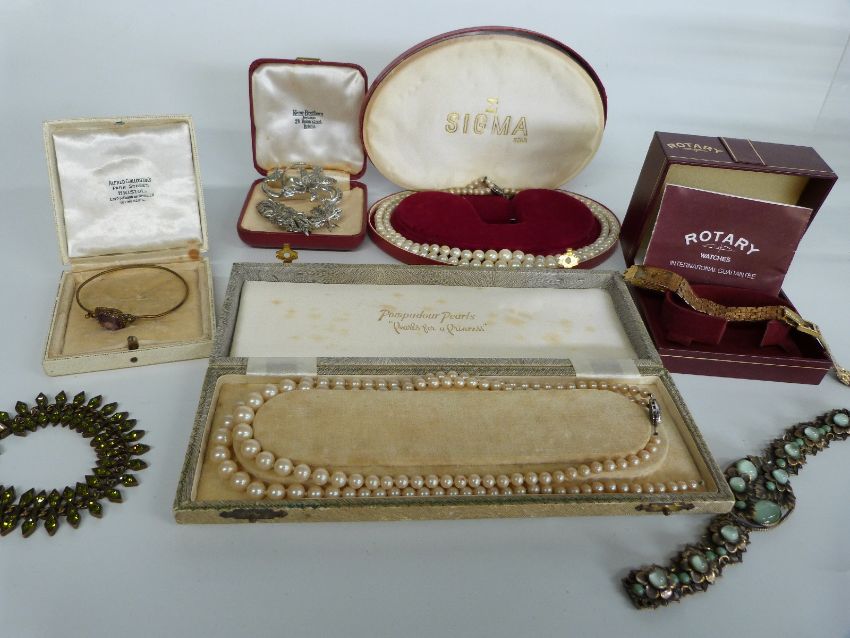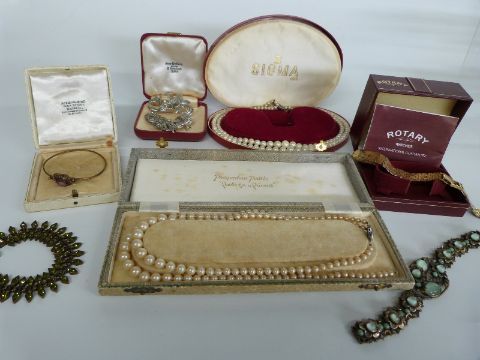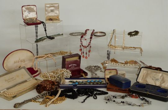 A large collection of costume jewellery including necklaces, green paste necklace, copper jewellery, vintage boxes, faux pearls, marcasite brooches, etc