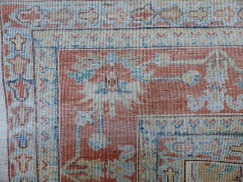 Beige ground rug with pink and blue decoration, 294 x 204cm