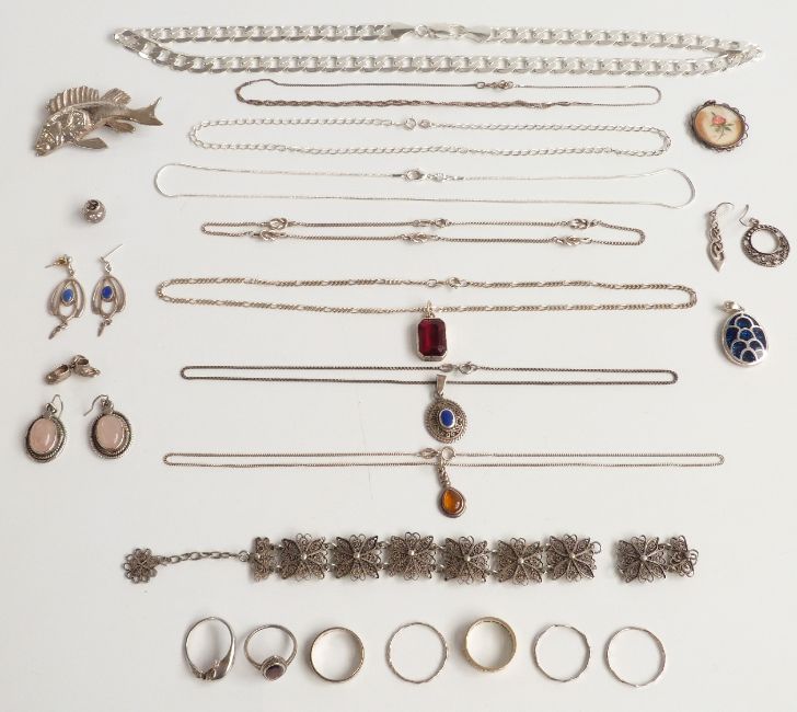 A collection of silver jewellery including a large curb link necklace, 9ct gold and silver ring, silver chains, silver earrings, etc