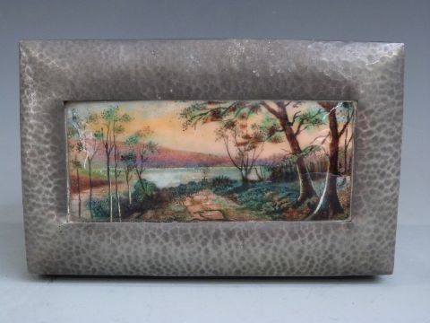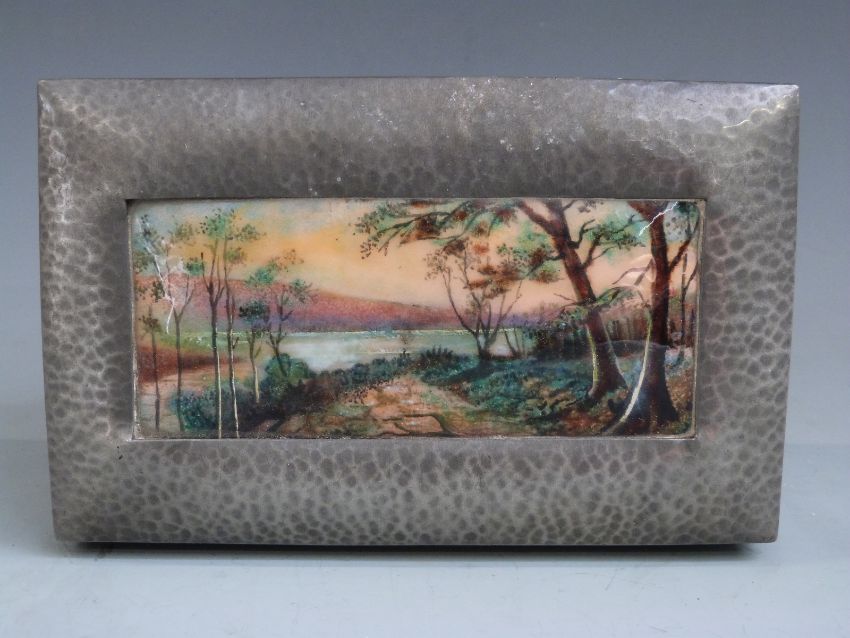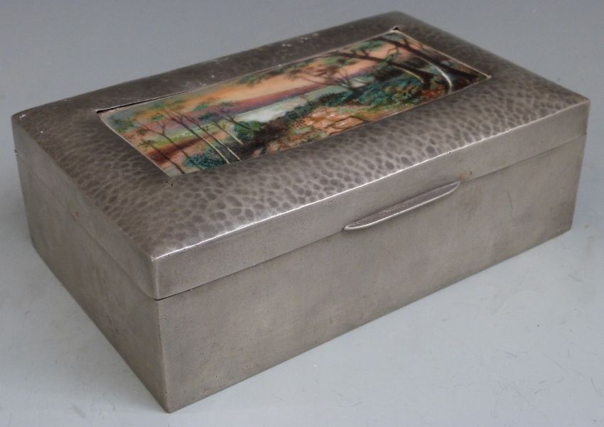 Tudric Pewter and enamel box with hinged lid, likely for Liberty and Co. The inset enamel copper plaque decorated with a lakeside scene, probably by Fleetwood Charles Varley, cedar lined and impressed Tudric 01021 and Solkets (Solkets was a mark used by Haseler and Co who supplied Liberty) W18.5 x D11.5 x H6cm, the inset plaque 6 x 13.5cm
