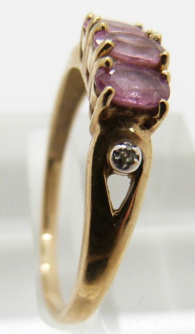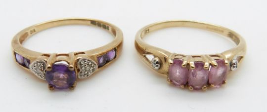 Two 9ct gold rings one set with an amethyst and diamond and the other set with pink sapphires, 3.8g