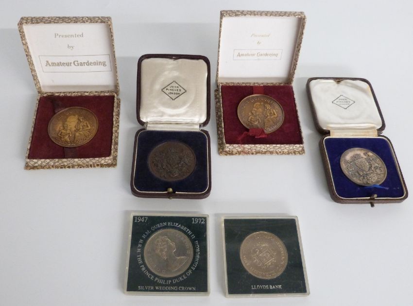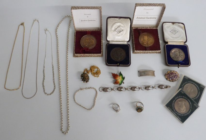 A collection of silver jewellery, silver and enamel maple leaf brooch, costume jewellery, coins, silver medallion for the National Rose Society, etc