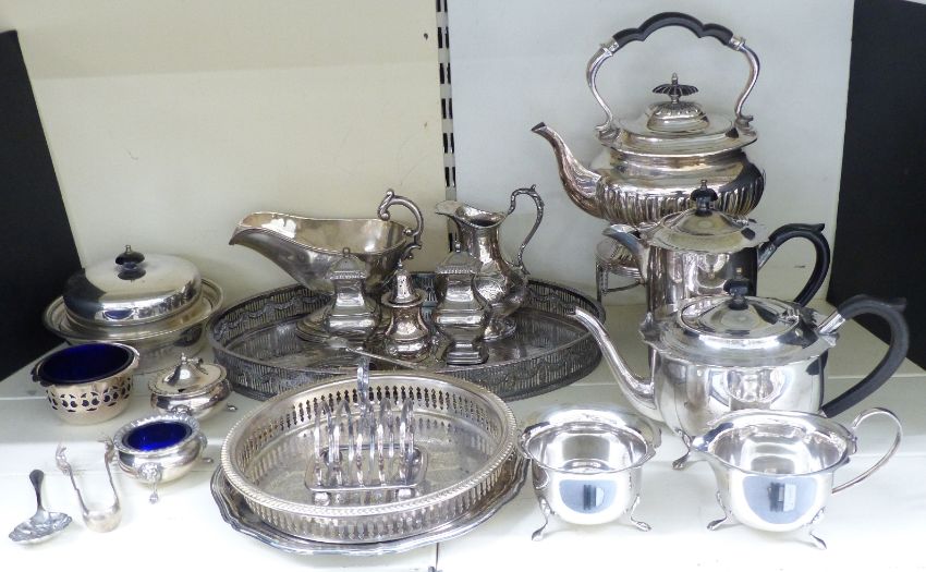 SIlver plated ware including oval galleried tray, length 38cm, spirit kettle on stand, teaware etc,
