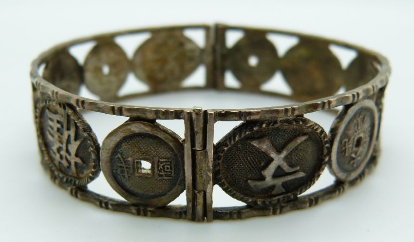 Chinese silver bangle by AW with bamboo and character decoration