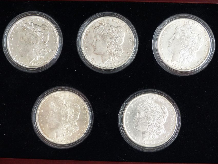 Five Decade Set of Uncirculated Morgan Silver USA dollars, in deluxe case