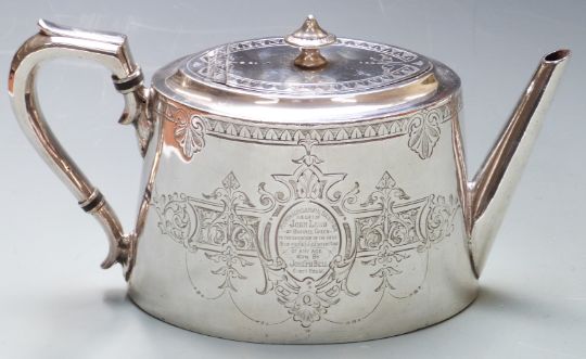 Silver plated presentation teapot engraved 'Penrith Agricultural Society 1874 the gift of John Lamb of Burrel Green to the exhibitor of the best Blue Faced Leicester ram of any age won by Joseph Bell Croft House' marked James Dixon & Sons, length 26cm