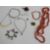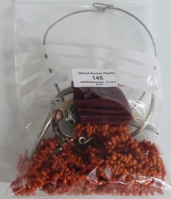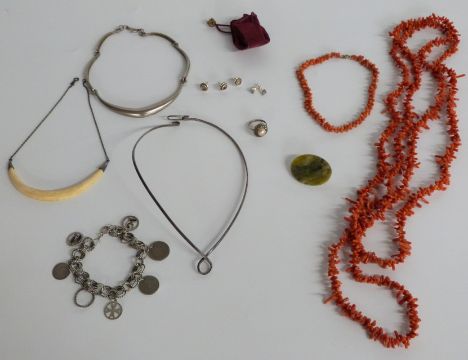 A silver necklace, two coral necklaces, silver bracelet, silver earrings etc