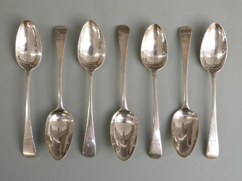 Seven Georgian hallmarked silver Old English pattern dessert spoons, length 17cm, five being London 1813 maker George Smith (III) & William Fearn, weight 233g