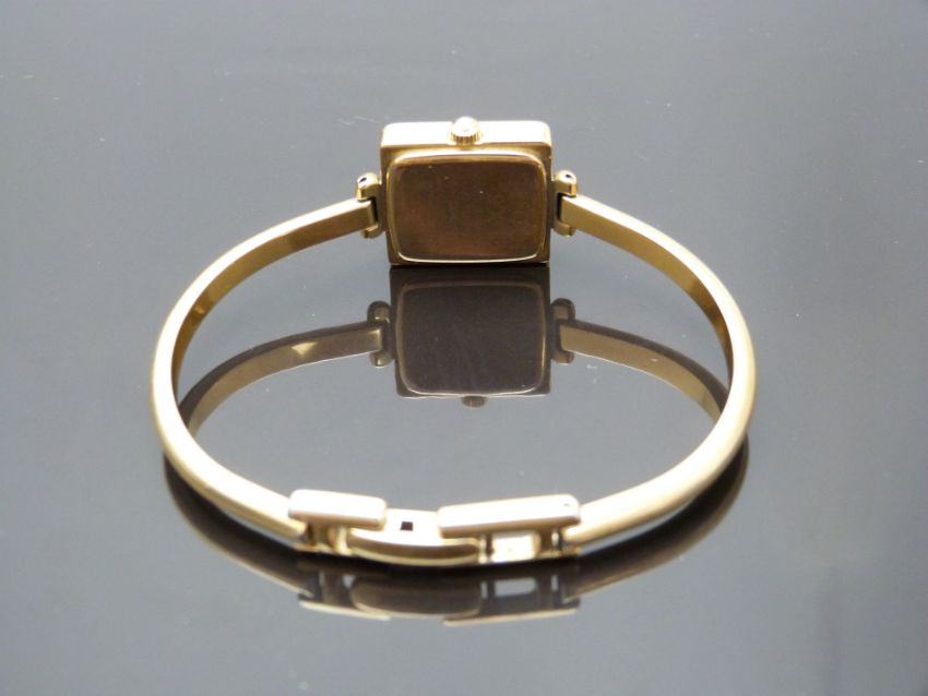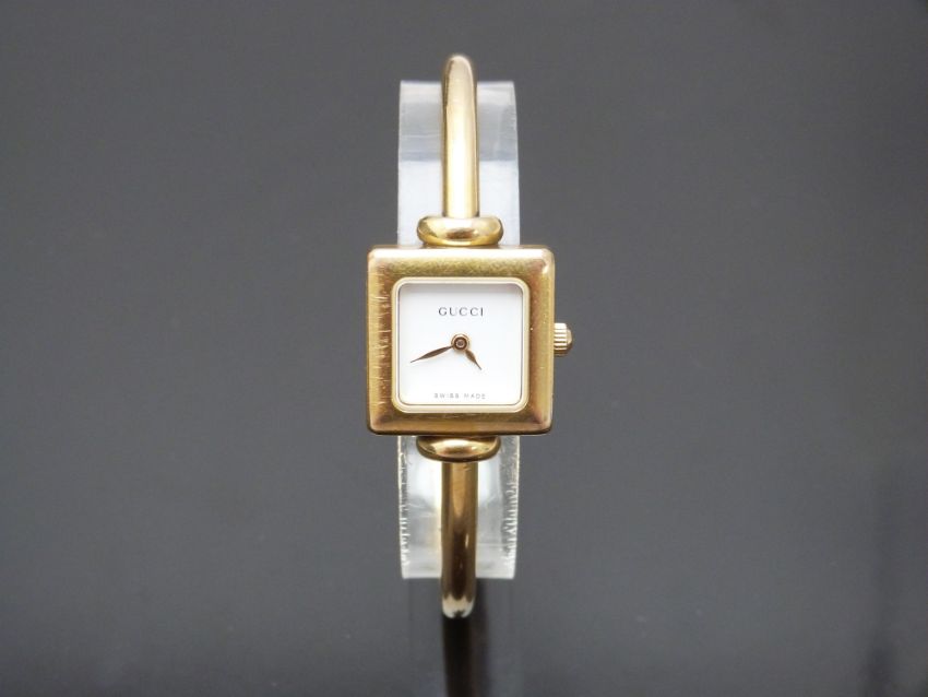 Gucci gold plated ladies wristwatch ref. 1900L with gold hands, white dial and quartz movement, on gold plated bracelet, case size 19x19mm, serial number 0377698, in original box.