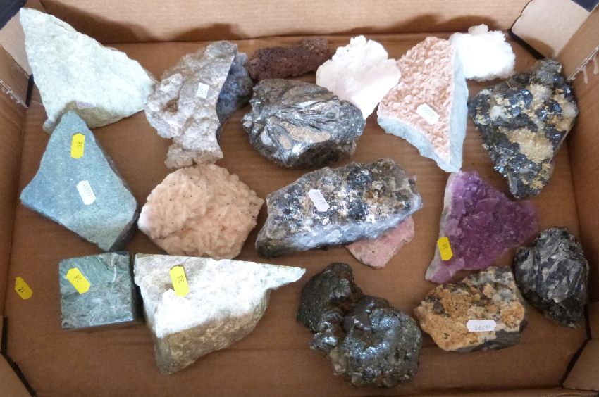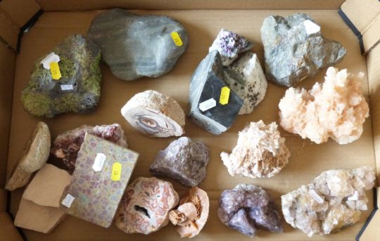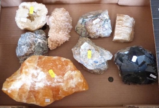 A large collection of mineral samples including quartz, gypsum etc