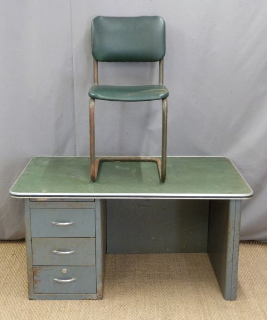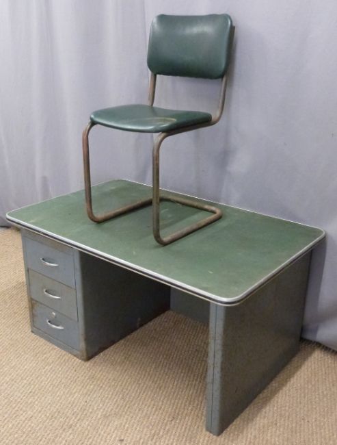 Industrial desk and chair, the chair marked Omal, W122 x H62 x D80cm