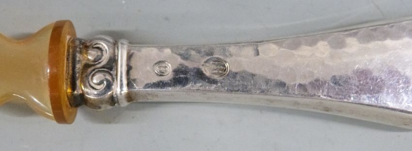 Danish white metal handled salad server, white metal ashtray and a white metal tea strainer, length 13cm