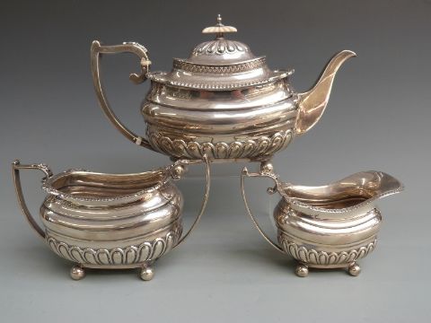 George V Walker and Hall hallmarked silver three piece teaset with reeded lower body and raised on four ball feet, Sheffield 1916, length of teapot 29.5cm weight 1394g all in