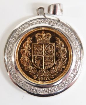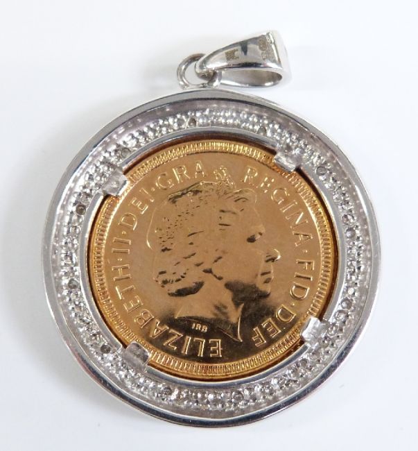 2002 gold half sovereign in 9ct white gold mount set with diamonds, 9.25g all in