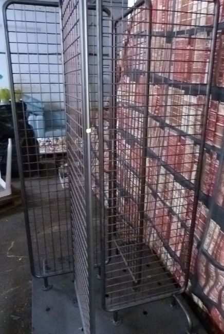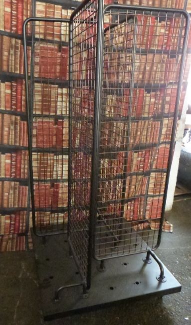 Industrial/haberdashery/shopfitting steel and weldmesh multi directional display stand/ hanging rail on wheels, W100 x D100 x H200cm