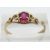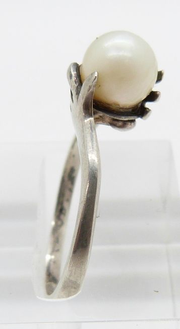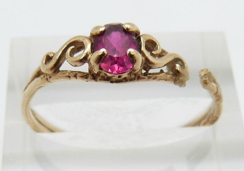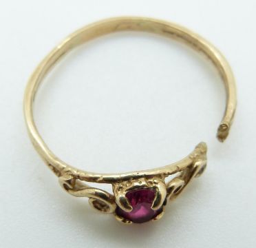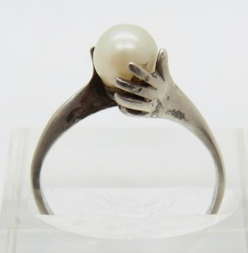 A 9ct gold ring set with a synthetic oval cut ruby and a white metal ring with hands clasping pearl, 2g, size M
