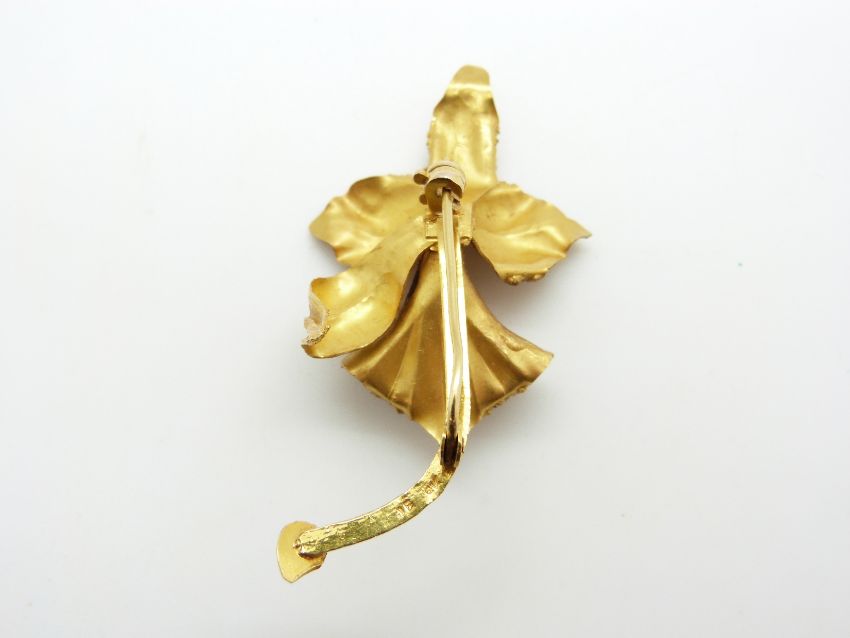 A 9k gold brooch in the form of a lily set with a pearl to the centre, 11.9g (5.7 x 3.2cm)