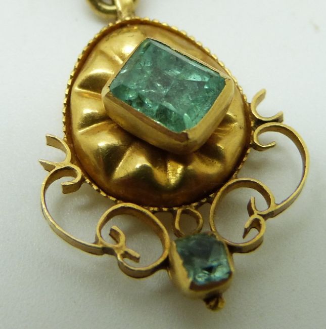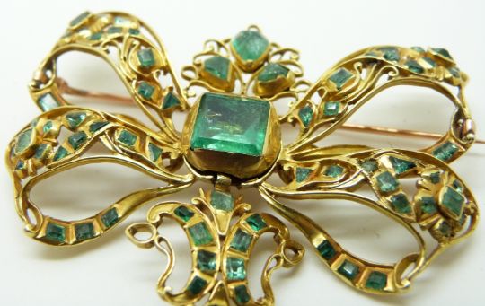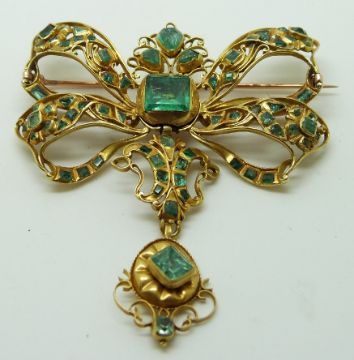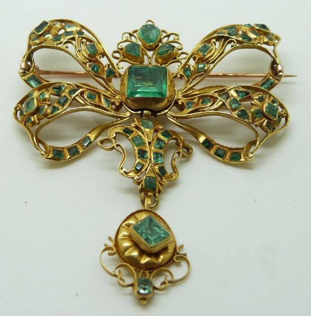 19thC pendant/ brooch set with emerald cut, pear cut and triangular cut emeralds, possibly Spanish, 6 x 7cm, 26g