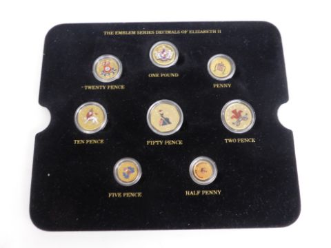 Three deluxe cased coin sets comprising, predecimal and decimal emblems of Queen Elizabeth II, London Mint Office super crown sized Britannia and reflections of her majesty's 80th birthday
