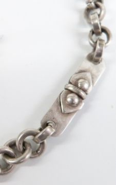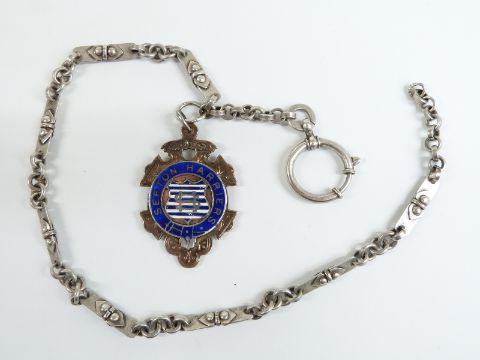 A silver watch chain with a hallmarked silver and 9ct gold fob set with enamel reading 'Sefton Harriers', 35cm