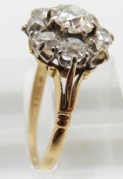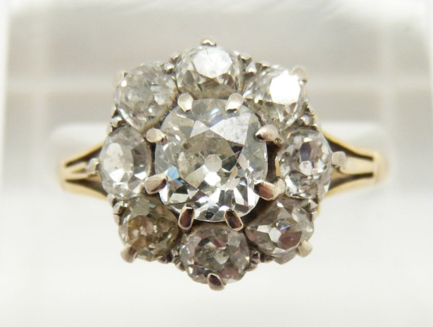 Victorian 18ct gold ring set with old cut diamonds in a cluster, the centre diamond approximately 1ct, the surrounding diamonds each approximately 0.15ct, total diamond weight approximately 2.2ct, 3.1g, size O